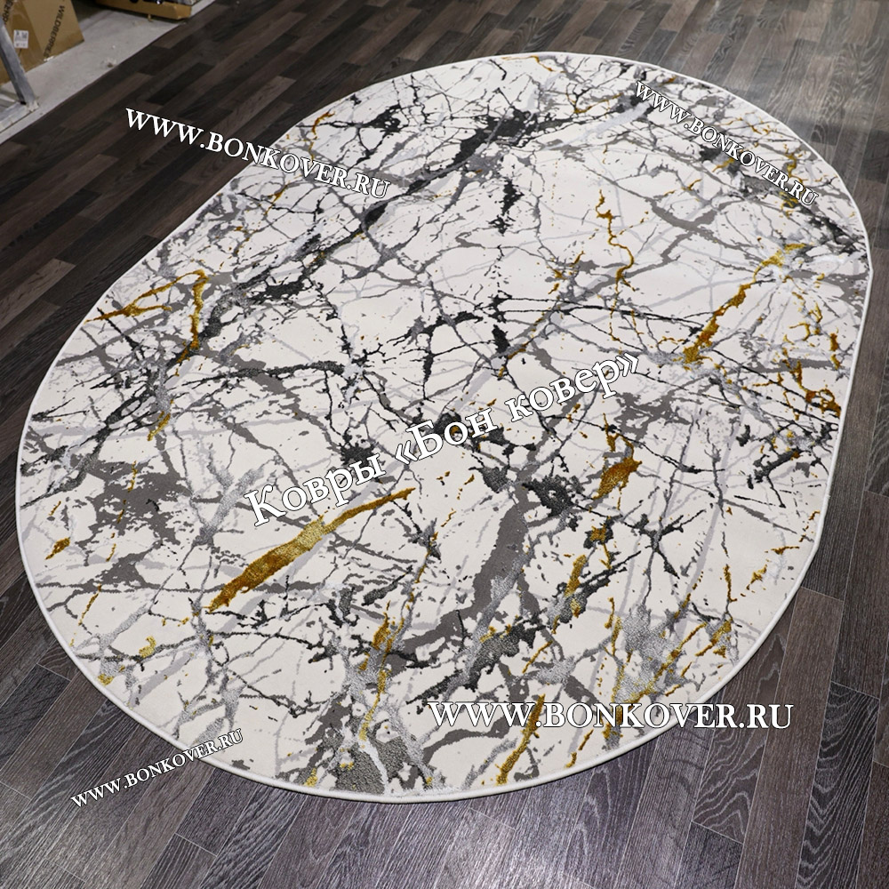 Изящный Турецкий Абстрактный Ковер Белый с Золотистым Арт 30325 наполняет интерьер квартиры теплом и уютом, гармонично сочетает в себе изящество и стиль. Он соткан из высококачественного сырья, прочный и долговечный.